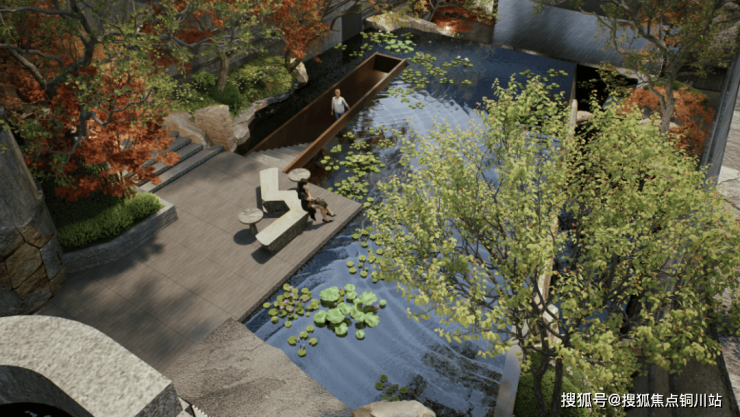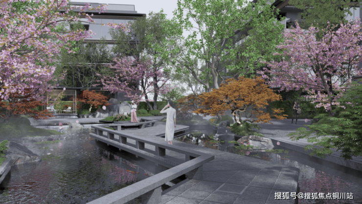 项目通过立体规划手法,形成“三境、二园、一脉”的空间格局:南侧设置约1.2万平方米公共空间,包含“城市灯塔”“序列感希腊柱式廊道”等设计元素;北侧打造“溪谷式”庭院,建筑退台与景观台地结合形成沿街绿色界面;场地内设置采光井,将地面景观引入地下车库,提升地下空间的自然采光效果。