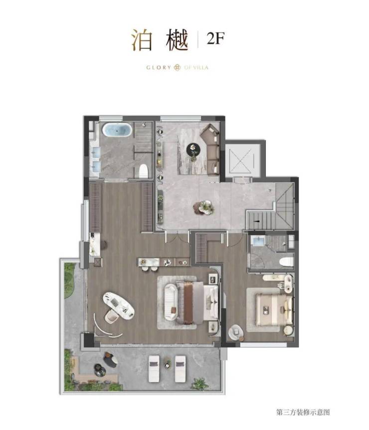 二层朝南约11.8米的超大面宽,让更多起居空间都能享受到阳光的浸润;连接主卧的约13米L型转角阳台,为主人预留了一片打造“空中花园”的自留地。