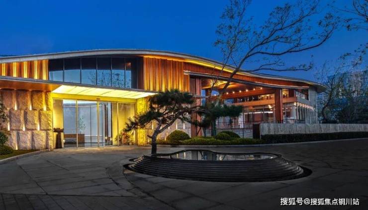 主入口结合中式景观设计,形成东方气质的酒店式归家,利用约1/4沿街面,为社区打造特色弧形会客厅大屋顶,入口来自泰山地区的特选黑松,配以曲水流觞式的镜面水景,借景入园。