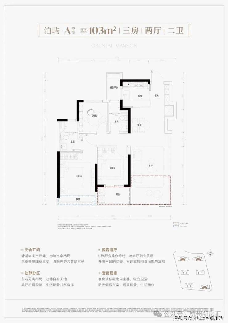 建面约103平,三房两厅两卫。三大亮点分析:① 南向三开间,朝南次卧带阳台,客厅联通阳台后,空间阔绰;② U型厨房且半开放设计,玄关含S墙冰箱位,利用率高、采光更优;③ 新规户型得房率高达约90%以上。