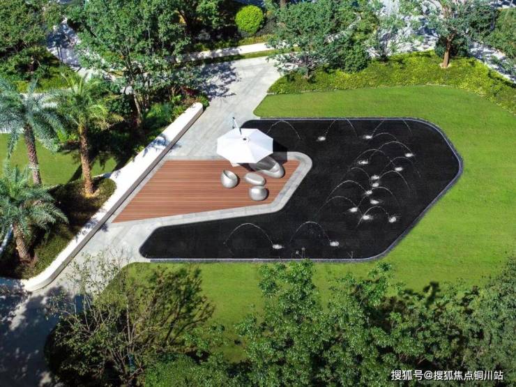 再进而来到灵动跳泉区域,开阔的观赏草坪加上愉悦的喷泉水景,在舒适的木平台造就一片悦享休闲之地。南侧的森林户外影院与儿童活动提供户外活动休闲的空间,在这里享受自然、增加亲子互动、满足亲子交流与儿童交友成长。