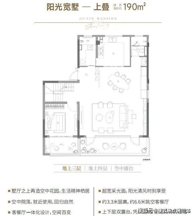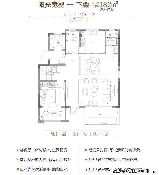 其中上叠约3.3米层高、约6.6米挑空一体化客餐厅,三楼露台挑空设计,实现全赠送;下叠也是约3.3米层高、约6.6米挑空客餐厅,还有约3.6米挑空地下室,带入户花园、南北及地库独立入户……(户型图见下,左右滑动查看)