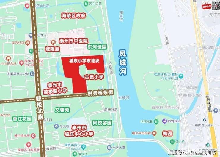 该地块东至海陵区玉带河、南至税务东街、西至规划邑庙东巷、北至邑庙街,一墙之隔就是城东小学鼓楼校区,东侧就是凤城河,北侧就是泰州中医院、海陵区人民政府……