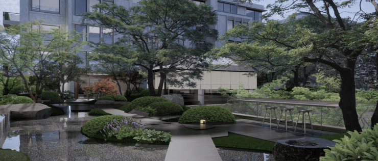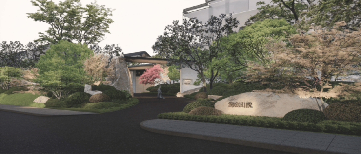 山和月入口门仪采用山园一体式设计,规制隐奢酒店式环岛落客庭院,拓展约2700㎡红线外景观,打造百米城市山林界面,营造外隐内奢的尊崇感。