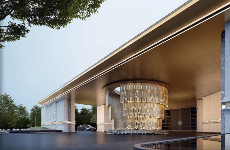 首先看52米宽的社区大门。最亮眼最中心的,是以“嵩山云雾”为主题的雕塑。独创的港湾落客区和双车道进出大门,也充满仪式感。地下中央车站,这可以理解为地下停车场的落客区,不管是业主归家还是访客,既方便又尊贵。以上是第一进,前院区。