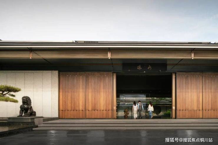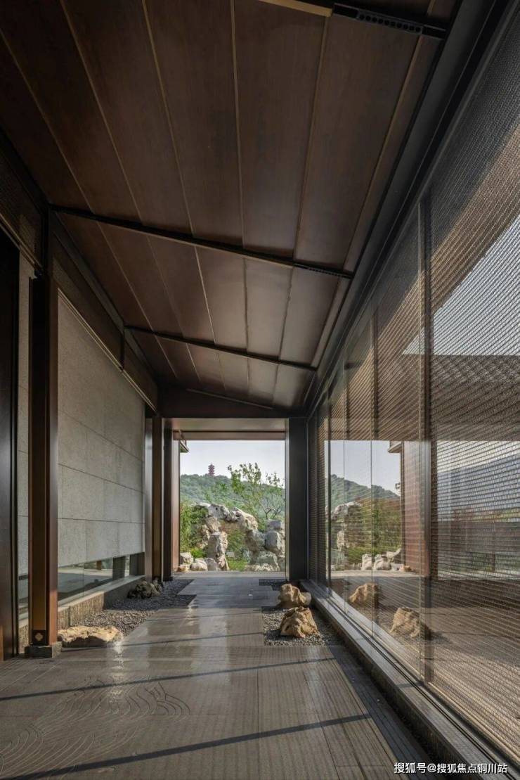 游廊设计灵感源自无锡寄畅园的“清蘌回廊”,廊墙之上开凿圆形墙洞,水底以宋代米芾《研山铭》为蓝本,采用白玉嵌金工艺铺就,既传承了文人赏石的雅致传统,又通过现代技法赋予水景金石韵味,负阴抱阳,虚实相生。