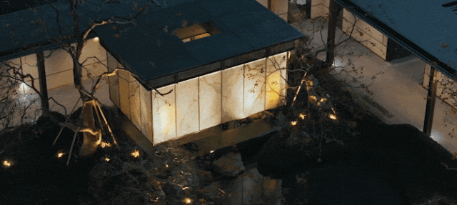 入口处那一整块黑石是远自河北的“中国黑”,进口的黑松更是百里挑一,价值不菲;