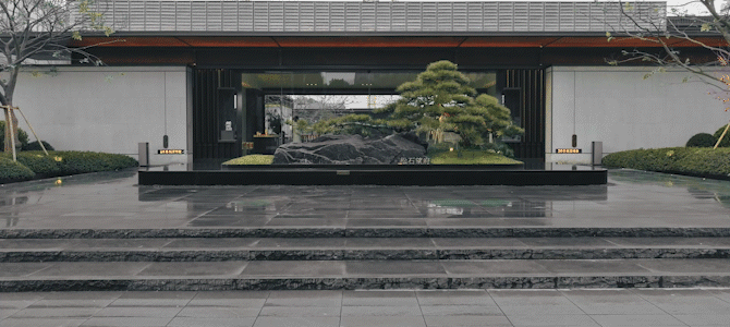 进入售楼处内部,视野豁然开朗,这就是核心景观——山水隐园。大面积的空旷水景,结合场地堆岛置石引流、搭配多重四季灌木乔树,有山有水,四季异景。