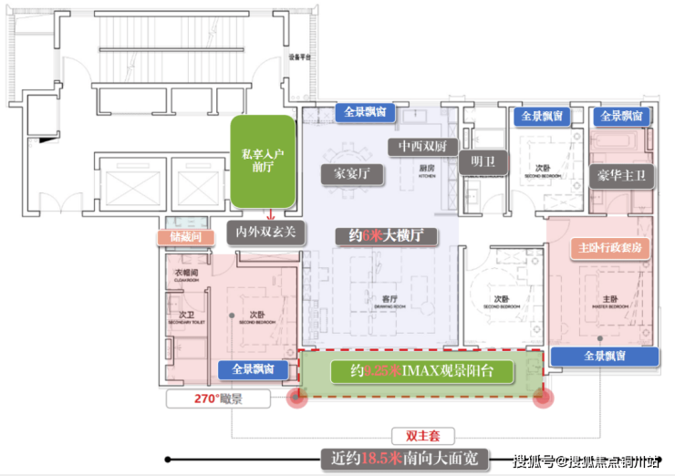 约18.5米南向面宽,超级LDKB一体化设计,四开间朝南。意味着家里四个主要房间(包括客厅)都朝南,通常只在220㎡以上的户型中才能见到,实现了空间利用的最大化。