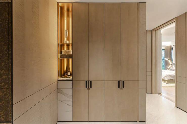 入户空间采用门墙柜一体化设计,材质上将木质的温润、石材的奢感、不锈钢的精致完美融合。设计上集展示与收纳一体,实现入户空间的价值最大化、风格一致化、功能齐全化。