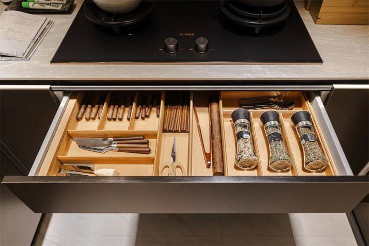 收纳设计:转角空间精细收纳、吊柜下拉拉篮收纳、餐具收纳、调料收纳、嵌入式电器,让厨房里的每一件物品,都有专属的摆放位置。