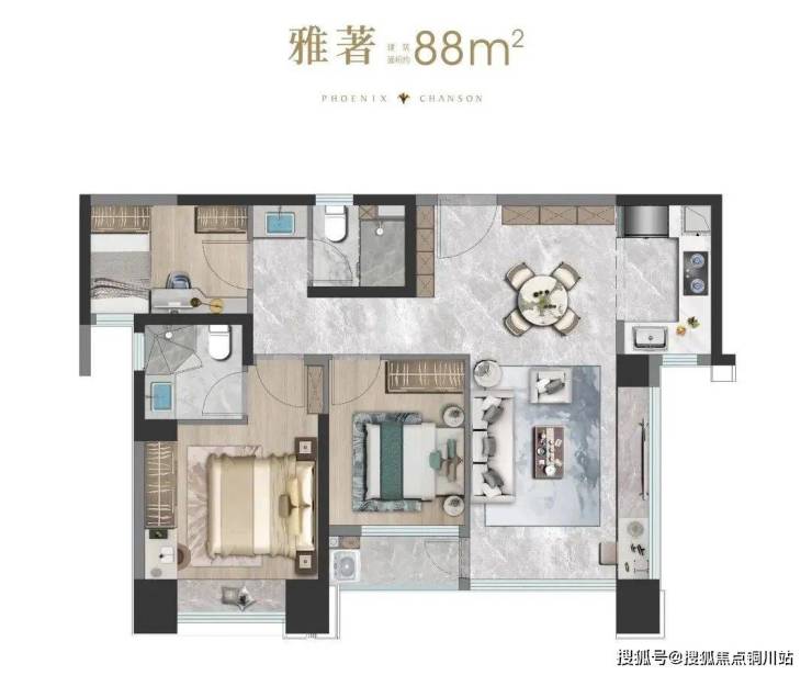 88㎡户型感觉一般:过道面积浪费有点多,餐厅是暗的,厨房面积较小。