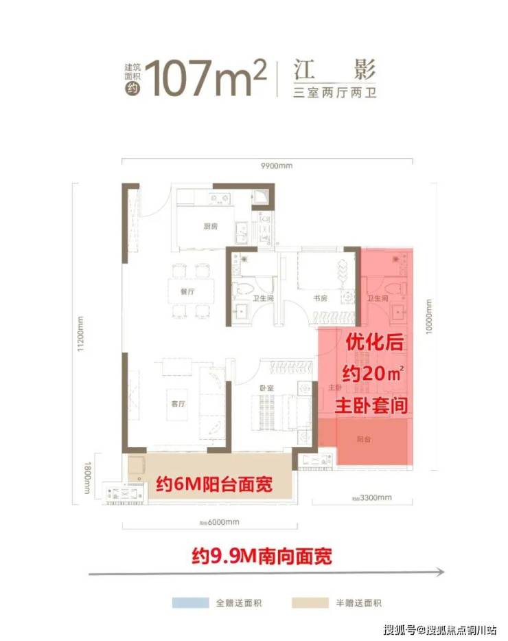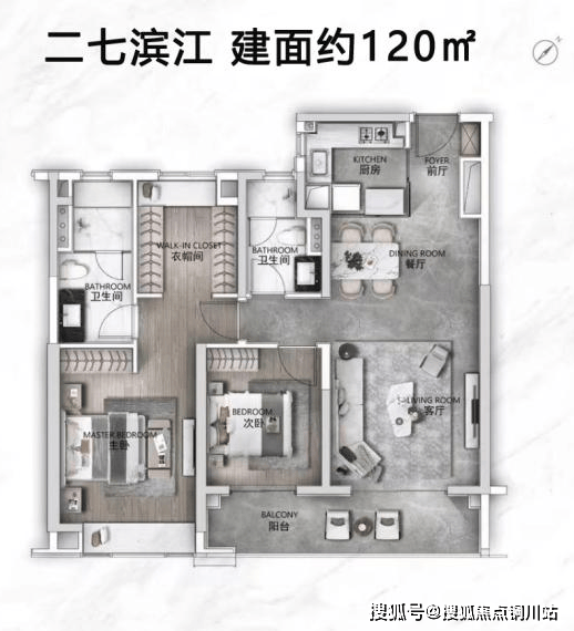 比如建面约107㎡三房两厅两卫产品,晃眼看上去,是不是有点像二七滨江120㎡的产品?