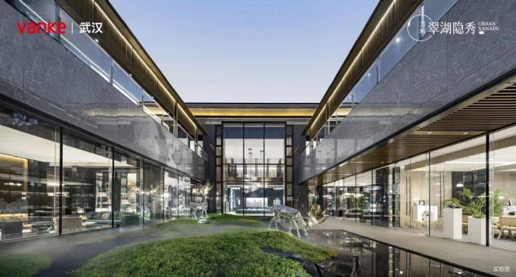 走入下沉式庭院,庭院中以画意布局造型花木与绿洲,透过高大的落地玻璃幕墙,室内的社区公共生活场景与室外园景融为一体,是翠湖隐秀全景生活、立体风景的真实表达。