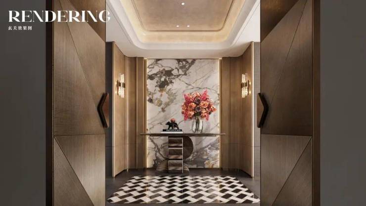 约47米超尺度迎宾门廊,带来气场强大的酒店式环岛落客区。搭配安哥拉黑皮革面花岗岩、爱马仕奢石等选材,为了美学不计成本,将星级酒店的归家礼序注入到每一寸空间。