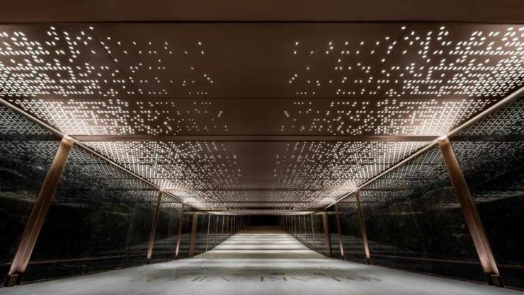 约6米高的车库入口,左侧为爱马仕黑廊柱,右侧为鎏金金属格栅,将豪宅的气势感拉满。