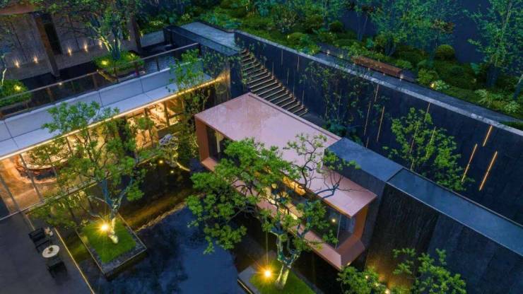 同时在会所外打造无锡罕见的三沉浸式会客区——约600㎡下沉式庭院+二楼星空露台+悬浮茶室,给到户外服务空间体验。