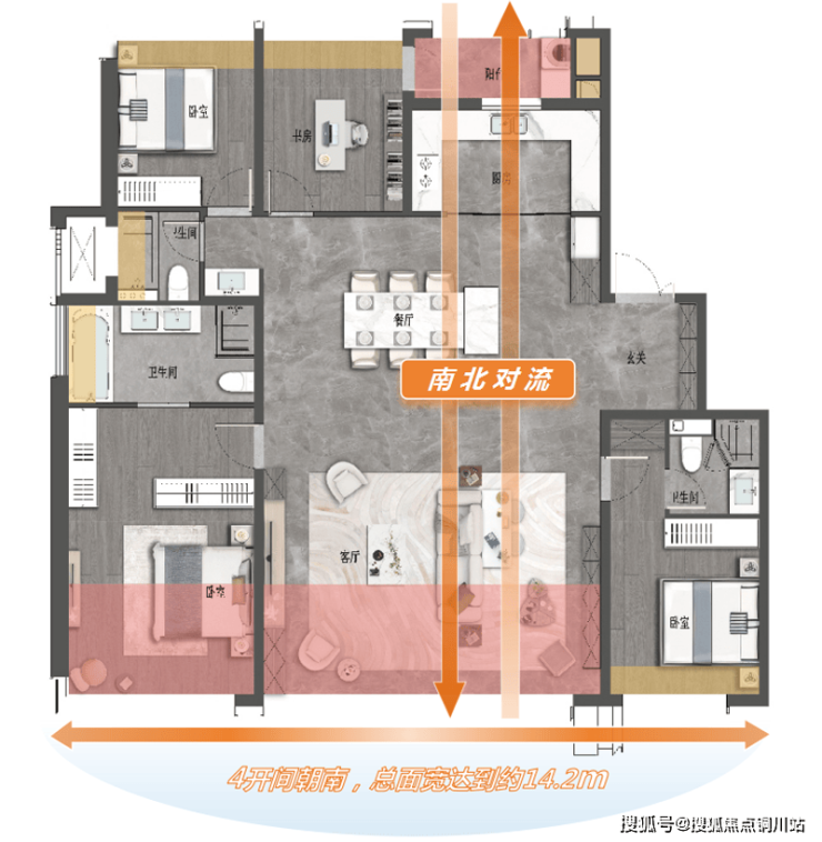 该户型实现全明采光,其中三个设计亮点尤为突出: