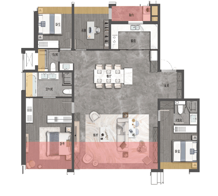 该户型最引人注目的亮点,在于通过减少室内承重墙的设计,让整体空间拥有了更强的自由度与改造弹性。