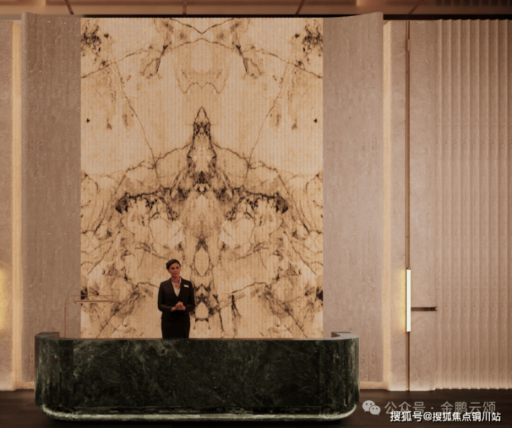 在立面的塑造上舍弃了工业化的光洁平整,回归充满温度的手工锤纹工艺,于金属表面留下万千变化的细腻纹路,使冰冷的材质在光影交错间焕发出动人的艺术生命力。地面铺装精选源自范思哲的黑色大理石,其深邃的色泽与自然的纹理,为归家之路铺就奢华底蕴。