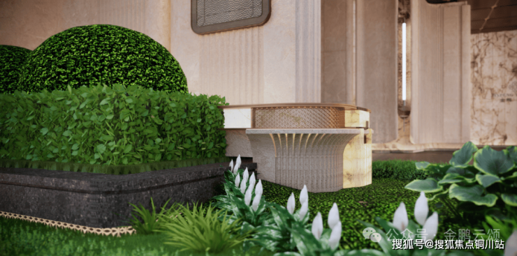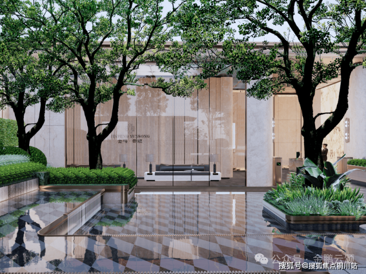 与之呼应的镜面迎宾水景,以静谧之态倒映天地,水面微澜,虚实相生,共同勾勒出一幅流动的现代东方画卷。上方的精铸华盖,以精心计算的弧度提供遮蔽,其结构之美与功能之善完美融合,于每一处细节中,无声诠释着高门大户的待客之礼。