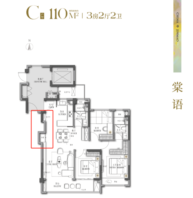 住过小户型的人应该都遇到过,买个双开门冰箱根本没地方放。于是金茂在建筑阶段前置预埋S墙设计,做了一整面收纳,并且安排了双开门冰箱的位置,户型图让大家看下就明白了。