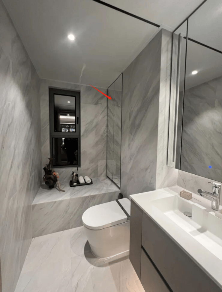 卫生间更恐怖!光是一个卫生间里的镜柜,金茂都能玩出新花样,下图是主卧卫生间一进门的实景,镜柜直接到顶,甚至侧面都做了镜面。