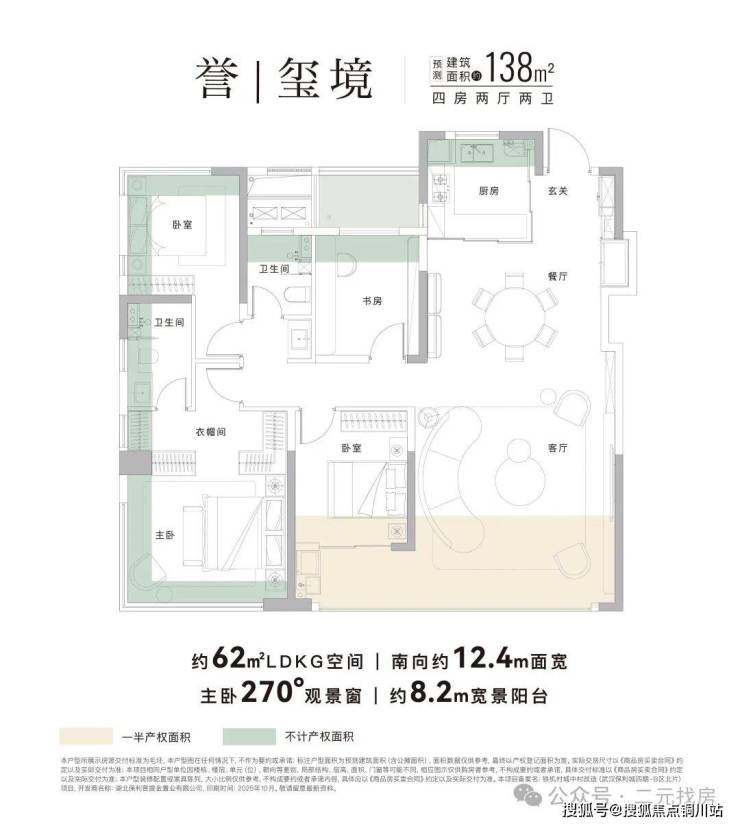 该户型为四房两卫,三开间朝南,入户玄关,南向面宽约12.4米,约8.2米的南向宽景阳台,完全动静分区设计,有62㎡的动区空间,双卧朝南,主卧为270°观景窗设计。