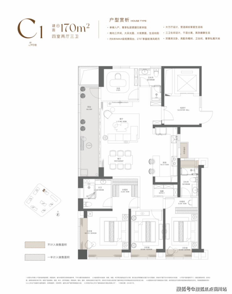 建面约170平,四房两厅三卫: