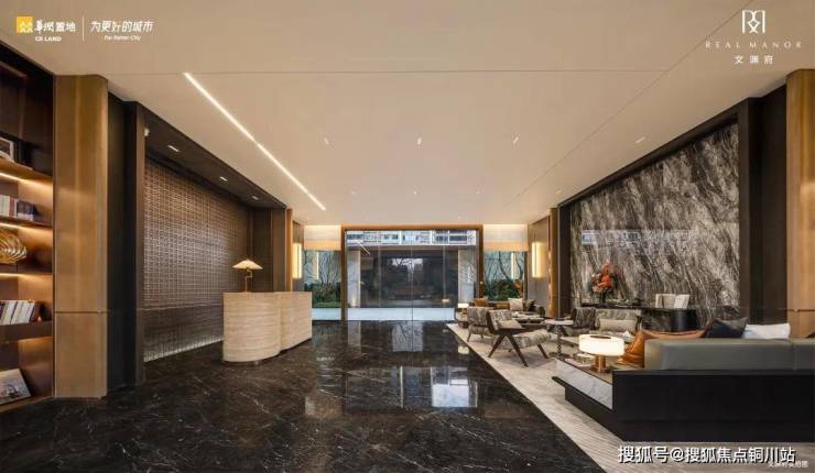 项目地下精装入户大堂,采用约4.4米金属格栅打造,带来星级酒店般的仪式感,星空顶辨识度很高。特别值得一提的是,华润升级的地上精装大堂,沙发、书架、大理石元素巧妙搭配,尽显优雅。