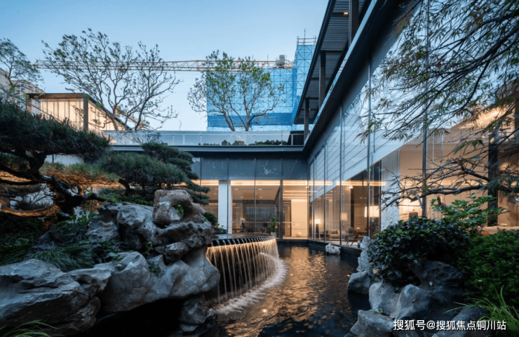 金茂府3.0标志性的下沉式庭院景观打造一个缩小版的苏州园林,采用以小见大的设计手法打造院中天地。其中的迎客松是从山东莱芜山区用直升机空运出来,再全冠移植运送到苏州,只为呈现山水真趣,处处皆景,不管白天还是晚上都非常惊艳。