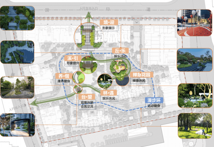“一带”,即从位于北侧国印道上的人行主入口开始,打造递进式空间体验带,在归家的路线上设迎宾大道。