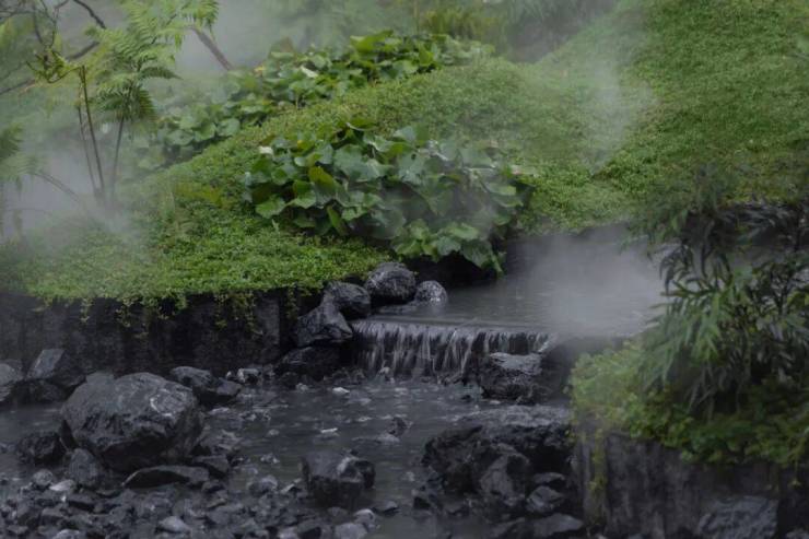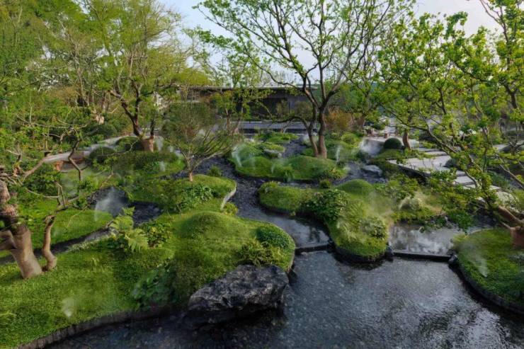 约1800㎡下沉林屿水院,“演绎虹夕诺雅酒店的自然山水,微缩到这里”,以浮屿为主题造山水庭园,林间小路拾级而上。