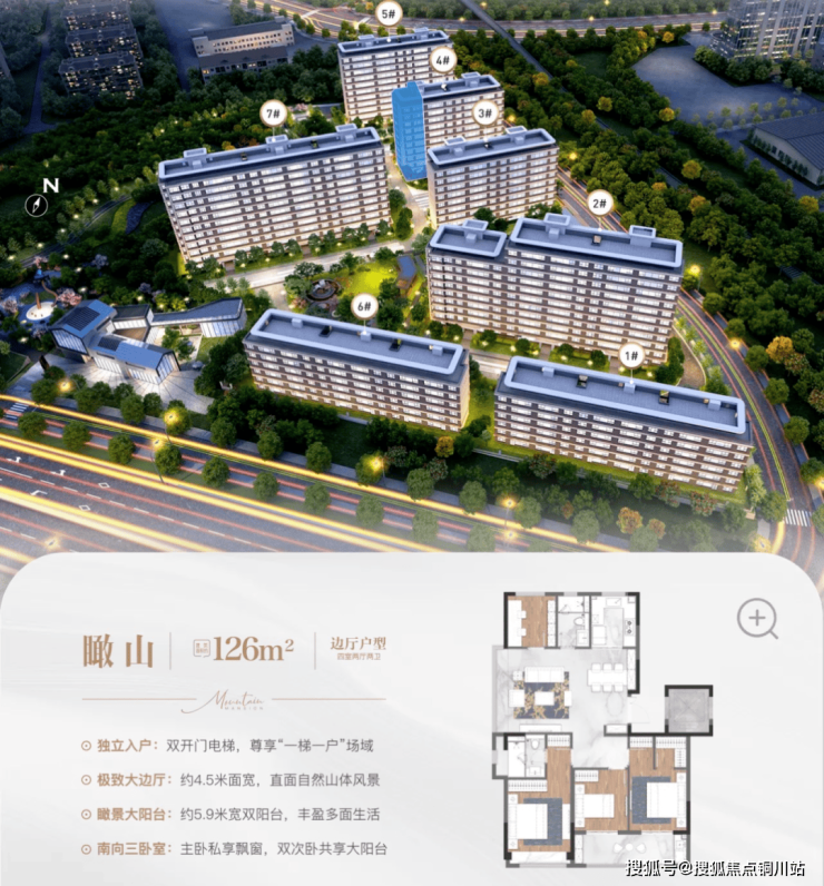 126㎡边厅户型,四室两厅两卫,双开门电梯独立入户,约4.5米面宽的边厅直面山体,搭配约5.9米宽双阳台,南向三卧室布局合理,主卧带飘窗,双次卧共享大阳台。