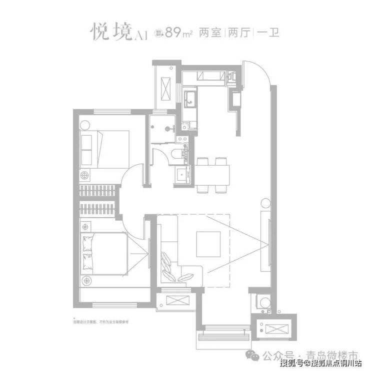 89㎡经典的动静分离户型,在寸土寸金的崂山,这种产品是很稀缺的。跟翡翠云城的大差不差,不过多介绍!
