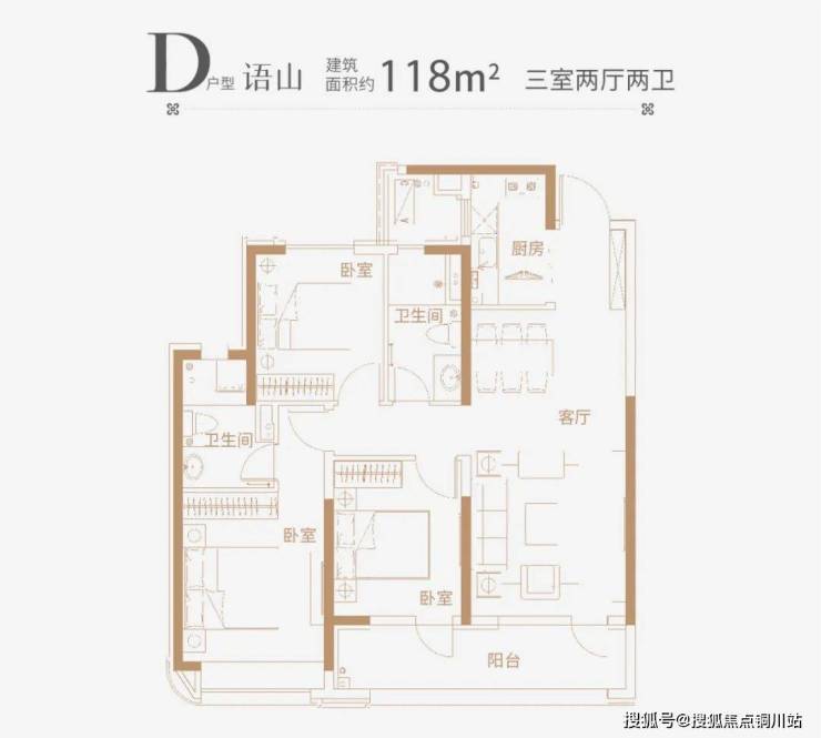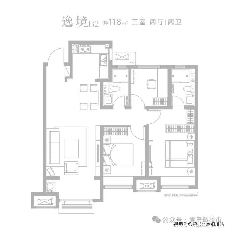 建面约118㎡三房两厅两卫,南向双开间,南向面宽也做到了极致的10米多,保证了采光和通透性,又为业主提供了极佳的视野。主卧套房也符合改善需求,没有一分浪费的面积,而且收纳空间强悍。