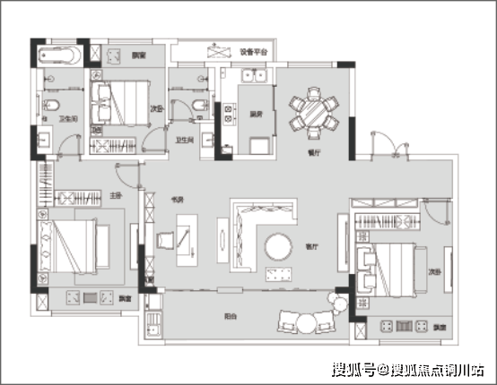 北向卧室与三段式干湿分离公卫,形成一个“类套房”布局,人居体验更舒适。三个卧室均带瞰景飘窗,加上约7.2米宽景阳台、设备平台等,附赠空间更大,约83%的超高得房率,让室内空间利用率更高。