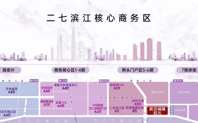 地理位置:位于江岸区沿江大道以北,京广铁路以南的汉口滨江国际商务区六期 A、B、C 地块,地处二七滨江六期,二环外但紧邻二环线。