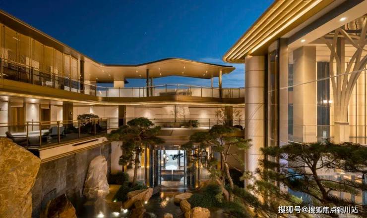 景观中庭的设计是市面上极为少见的三层观景式设计,以北宋画家范宽的《溪山行旅图》为范本,叠石、壑松及高低落差约15米飞瀑,亭台楼阁、檐下的游廊、小桥流水相互映衬,宛如一幅山水画卷。