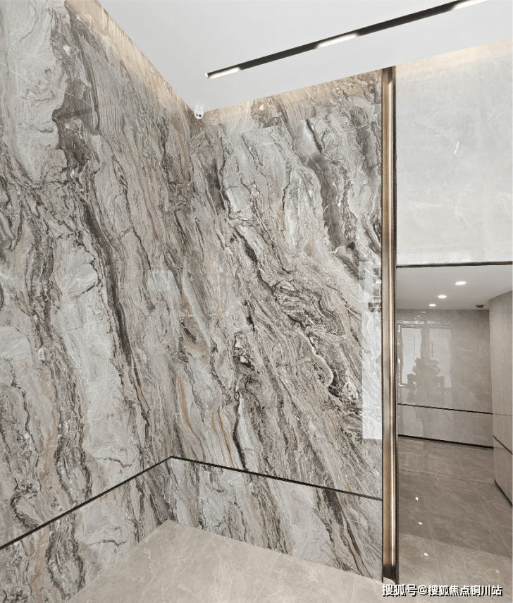 入户北大堂挑高达到4000mm选用大尺寸大理石纹岩板, 顺纹密拼组成了双面背景墙,损耗比高达4:1,同步设置造型古铜色金属腰线及踢脚线,营造出轻奢、雅致、高品质的归家大堂。