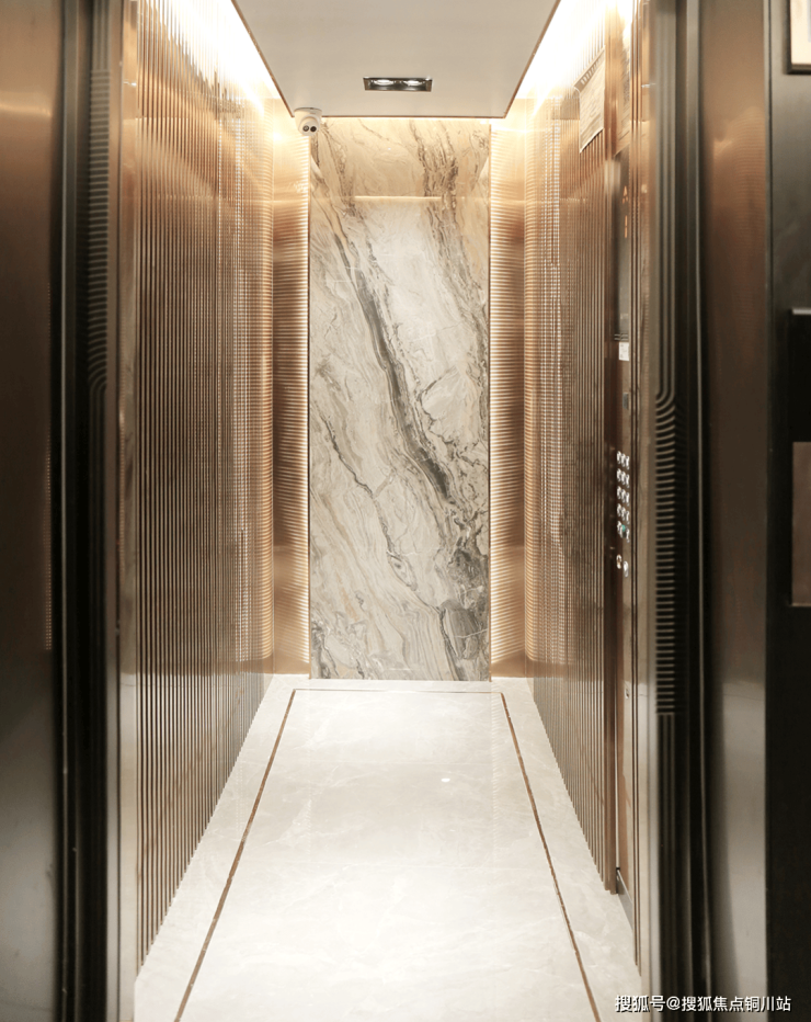 电梯采取了酒店式精装,采用了蚀刻不锈钢工艺结合岩板装饰。并且智能化加持,可以通过刷卡实现直达楼层。还能实现和每户的楼宇对讲户内分机在业主家里召唤电梯的功能访客也能通过楼宇对讲系统实现电梯开关功能。