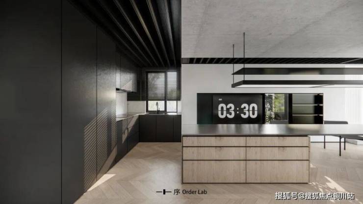 将原本的封闭式厨房改造为开放式厨房,巧妙地打破了空间的界限,极大提升了室内的通透性与宽敞感。橱柜选用黑色材质,与空间中原有的温润木色和纯净白色形成鲜明而和谐的对比,赋予了整个空间现代而时尚的视觉张力。