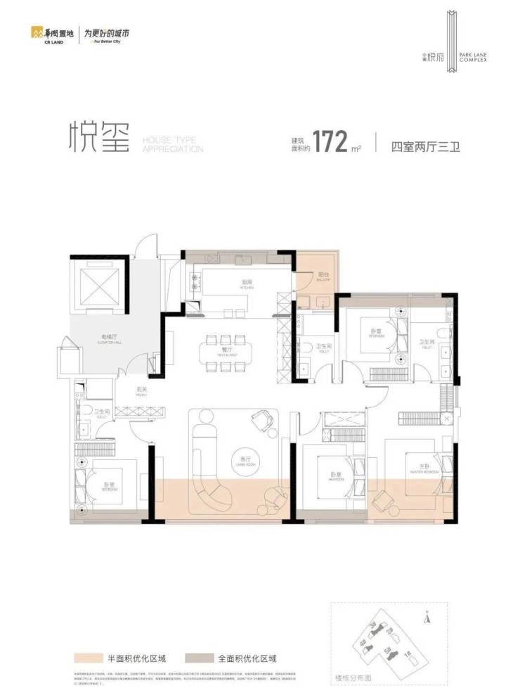 这是建面约172㎡四房,双主卧套房+生活阳台,与武汉天宸约165A户型设计类似