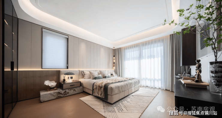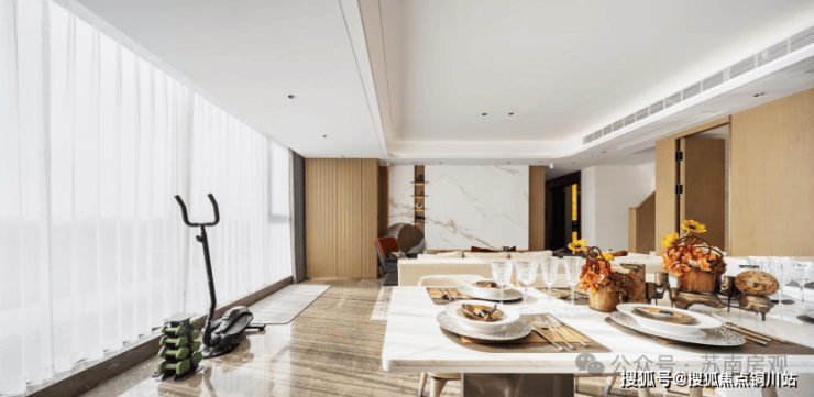 上叠约6.75m南向全景宽厅,将餐、厨、客、阳台无缝串联,形成开阔流畅的整体空间。巨幅玻璃幕墙引光入室,全天候光影变幻成为家中流动的艺术。南北通透的设计,不仅延展了视觉尺度,更将天际线定格为窗景,满足对空间尺度与视觉震撼的双重追求。
