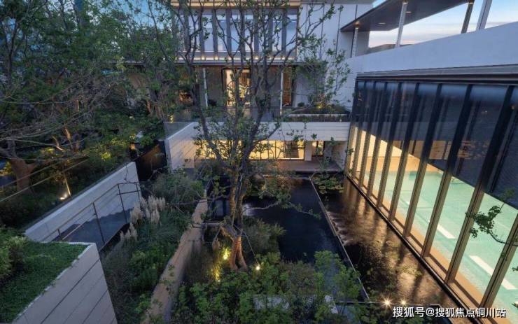 项目打造了约1300m²的全能会所,设置了恒温泳池、健身房、影音室等区域。恒温泳池一边是全屏落地窗,直面下沉庭院,另一边的背景墙由艺术大师打造,呈现雅奢艺术感。