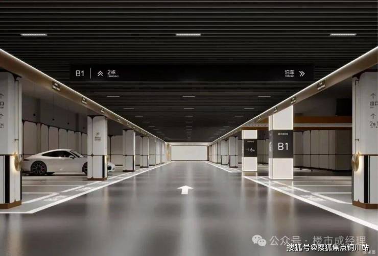 地下车库以星级酒店标准打造,铝格栅、星空吊顶与石材墙面,细节中彰显奢品质感。墙面嵌入夹丝玻璃壁灯与金属标识,地面采用环氧地坪漆,一站式全场景智慧无感停车体验,将归家升级为艺术与光感的尊崇仪式。