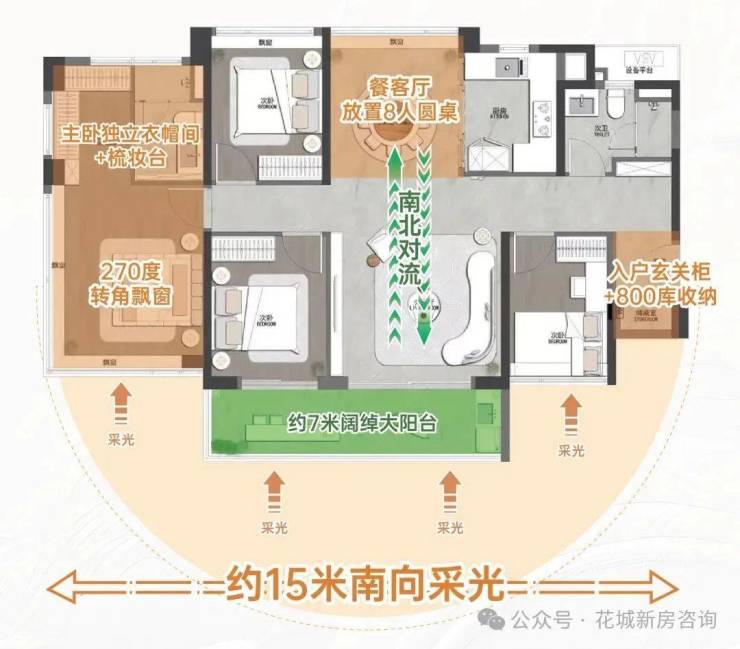 约116m²四房户型以设计展现尺度超越,居住体验堪比130+m²旧规户型。约15米四开间朝南、南北双阳台,采光通风升级。三卧室实现三面下床,其中主卧为全景舱设计,拥有270°景观飘窗,置200库洗手间收纳,拥有女神美妆冰箱,悦享精致生活。