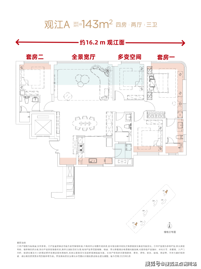 内部可细分江景休憩区、豪华卫浴间、步入式衣帽走廊,实现了五星级酒店套房标准的洄游动线