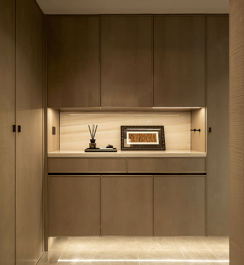玄关处的“万物仓”收纳系统颇具巧思,作为家庭后勤中心,可轻松收纳换季衣物、运动器材、工具箱等。