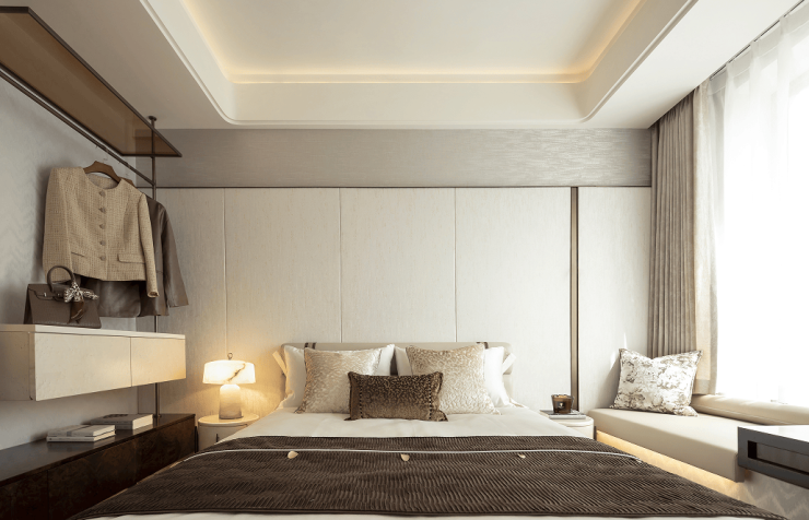 主卧开间达4.1米,除放置大床外,还可轻松容纳床头柜与休闲椅。L型转角飘窗进一步提升采光与视野。